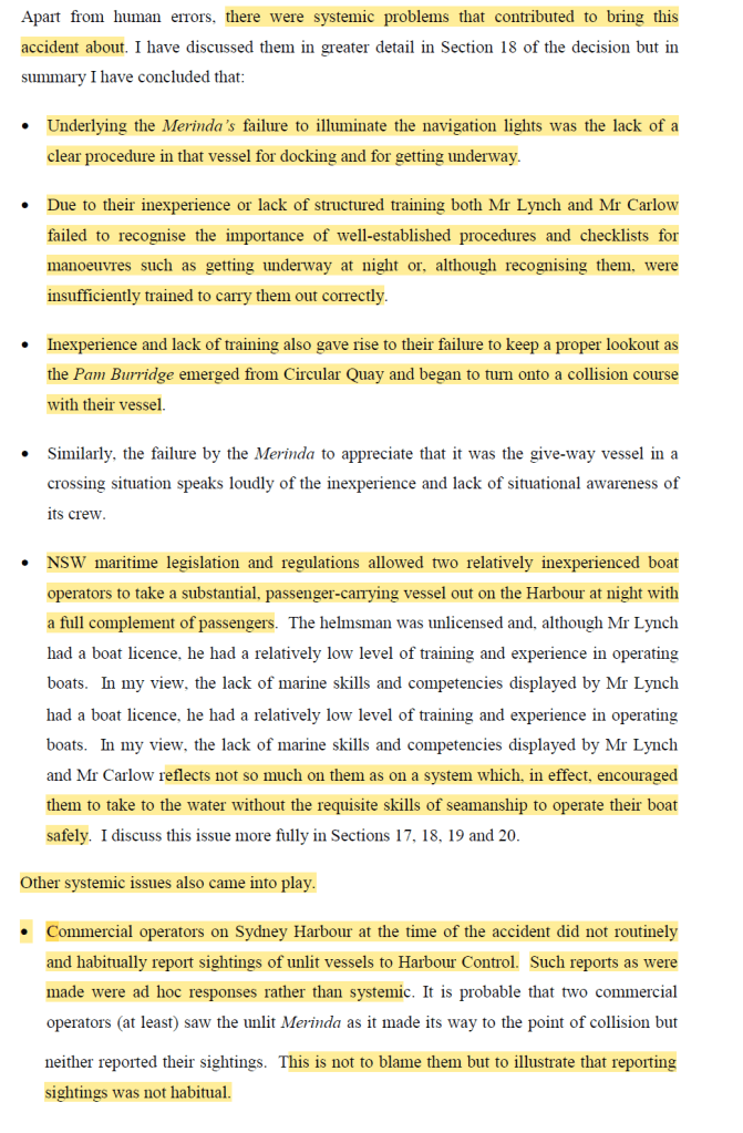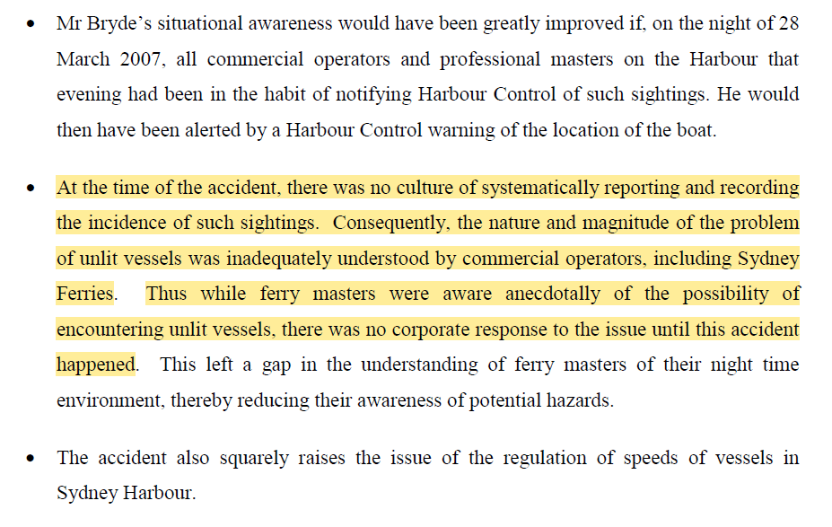 - “At the time of the accident, there was no culture of systematically reporting and recording the incidence of such sightings. Consequently, the nature and magnitude of the problem of unlit vessels was inadequately understood by commercial operators, including Sydney Ferries