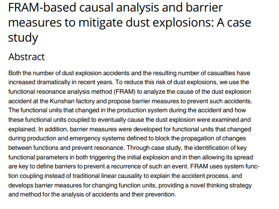 I imagine this will interest just a smaller sub-set of people, but this study used FRAM to analyse the dust explosion at the Chinese Kunshan factory accident, which killed 146 people.