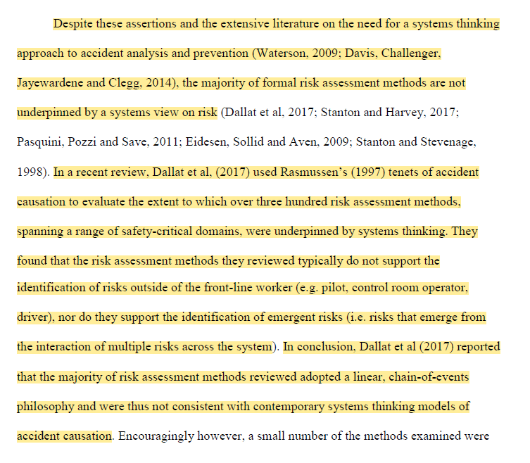 · Based on prior work from this research team, >300 risk assessments were evaluated – they found that “the risk assessment methods they reviewed typically do not support the identification of risks outside of the front-line worker (e.g. pilot, control room operator, driver), nor do they support the identification of emergent risks (i.e. risks that emerge from the interaction of multiple risks across the system)”