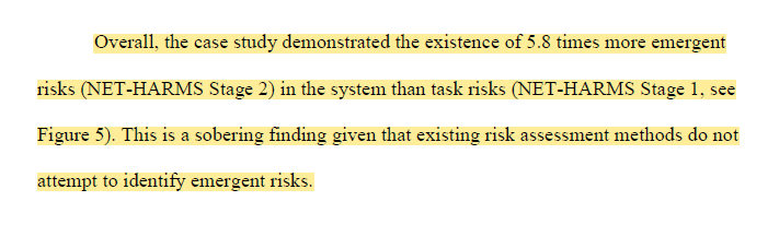 · “the case study demonstrated the existence of 5.8 times more emergent risks (NET-HARMS Stage 2) in the system than task risks … This is a sobering finding given that existing risk assessment methods do not attempt to identify emergent risks”