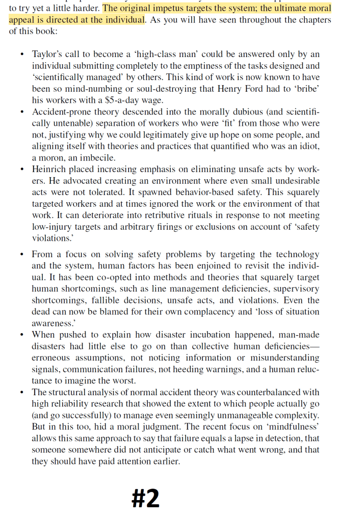 · Heinrich’s pioneering work was commandeered into behavioural approaches that “Squarely targeted workers and at times ignored the work or the environment of that work” and which could “deteriorate into retributive rituals in response to not meeting low-injury targets”