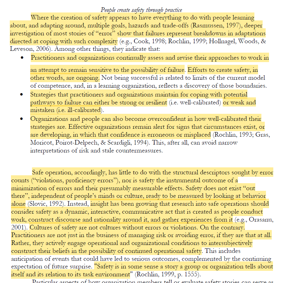- “safe operations should consider safety as a dynamic, interactive, communicative act that is created as people conduct work, construct discourse and rationality around it, and gather experiences from it”