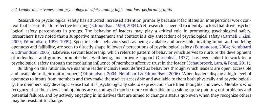 Leader inclusiveness was found to promote higher psychological safety within units and particularly among units with lower baseline performance levels. Quoting the study, “Unit psychological safety influences unit performance through the unit’s learning from its failures” (p113).
