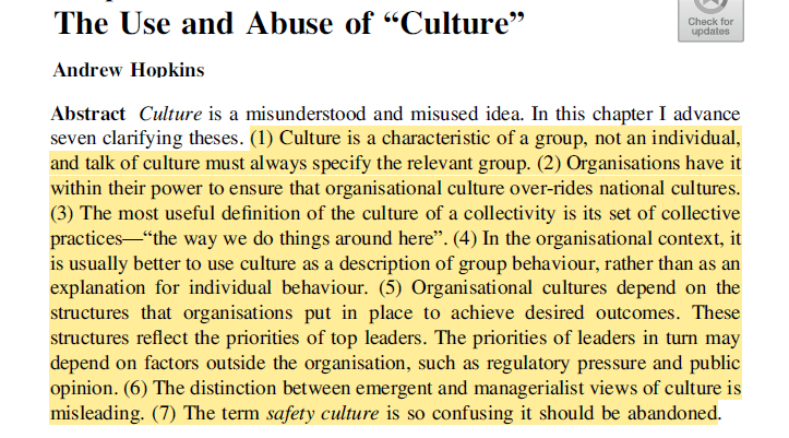 Author: Hopkins, A. (2018). The Use and Abuse of “Culture”. In C. Gilbert et al. (eds.), Safety Cultures, Safety Models, SpringerBriefs in Safety Management.