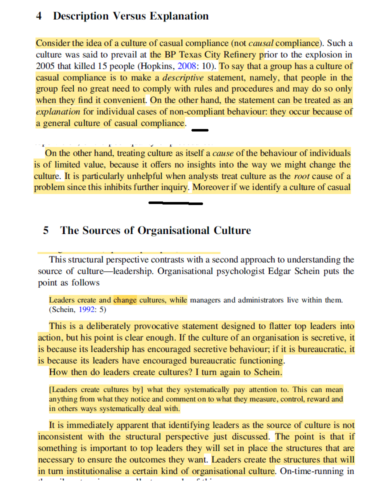 Hopkins briefly discusses how culture can be used or conceptualised in organisations. For instance, he discusses the idea of a “culture of casual compliance”, indicating a reluctance or indifference to following operational rules and procedures (as was described in the context of the BP Texas City accident).