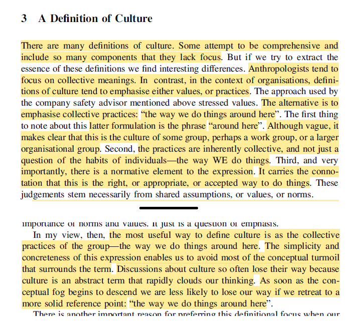He also likes this definition since it focuses on practices, and practices “can be directly affected by management while values cannot”. But ‘practices’ isn’t a superficial angle, and involves the change of values and norms, but this happens more indirectly due to factors like cognitive dissonance.