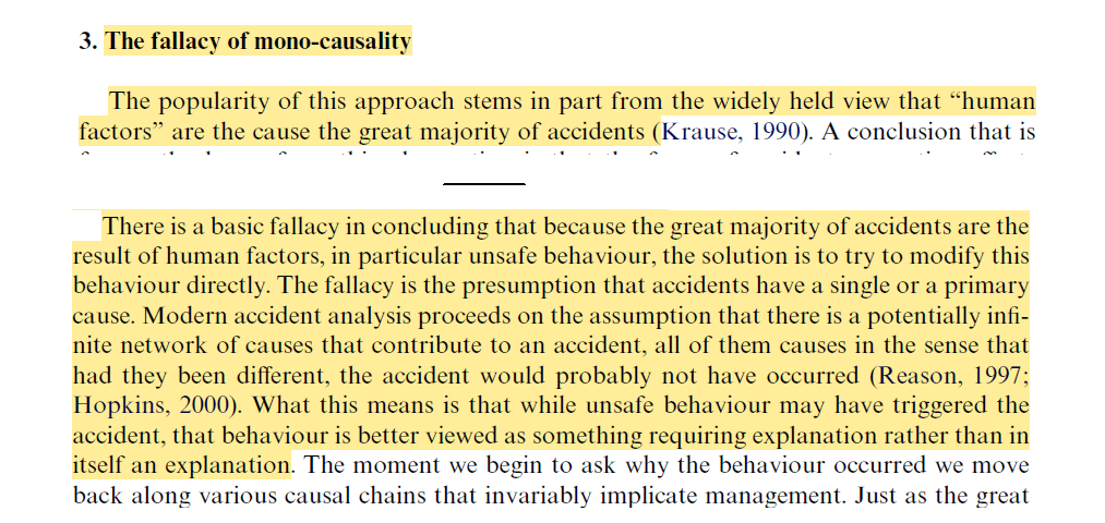 Hopkins argues that there is a basic fallacy is in prescribing behavioural approaches in response to the belief that human action ‘causes’ most accidents. That is, “The fallacy is the presumption that accidents have a single or a primary cause”.