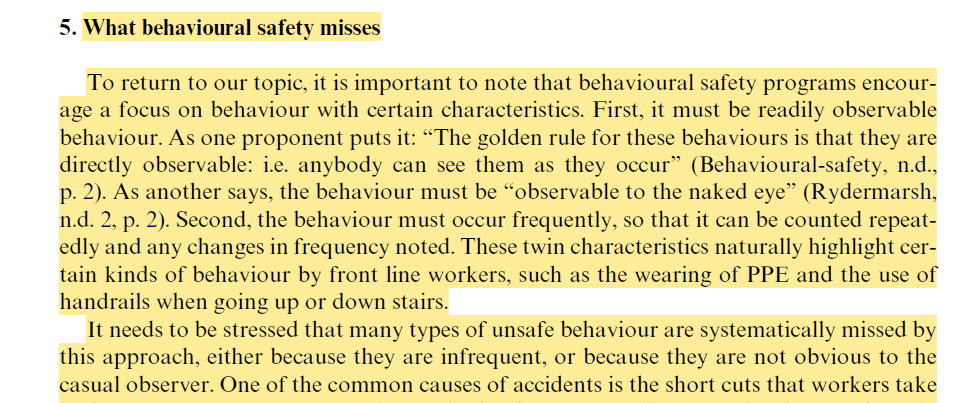 · “One major drawback of behavioural safety programs is that they miss critically important unsafe behaviour, such as attempts by workers to re-start processes that have been temporarily interrupted”