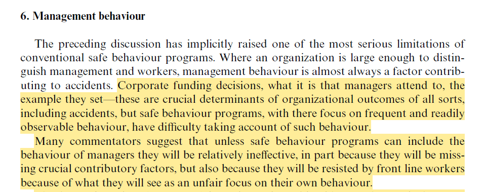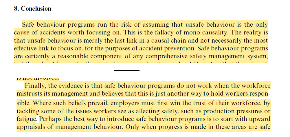 · “Conventional safe behaviour programs aimed at front line workers are also of no use in preventing accidents in which the behaviour of front line workers is not involved”