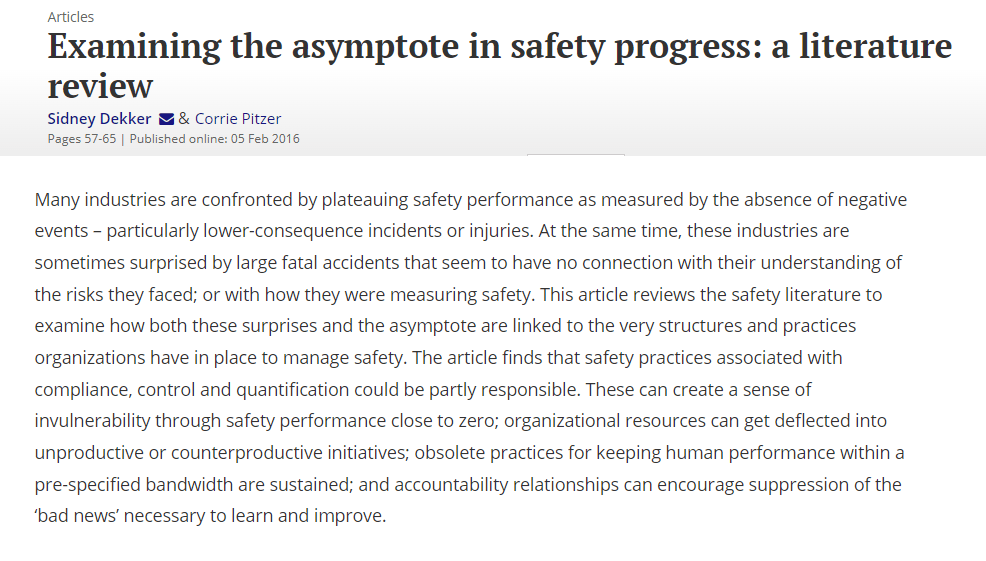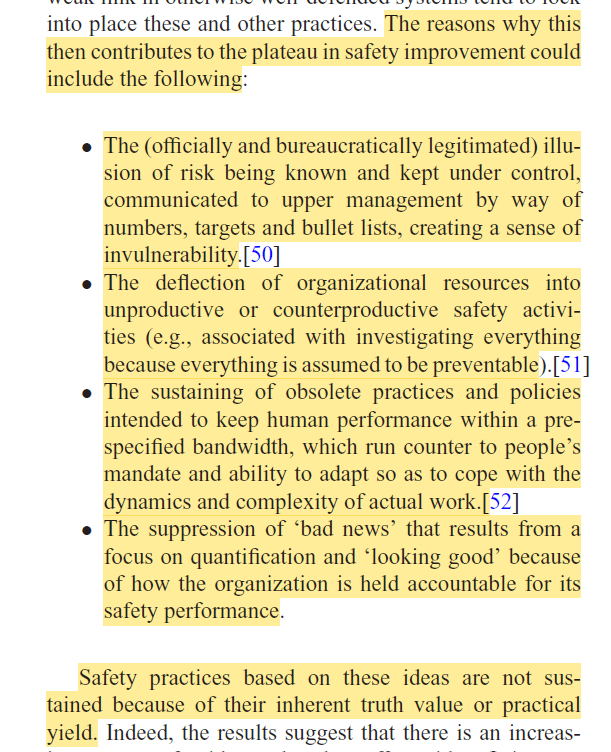 I can’t do it justice as it covers a lot of material, but the authors argue that a range of safety practices and beliefs are linked to a plateau in safety performance improvements.