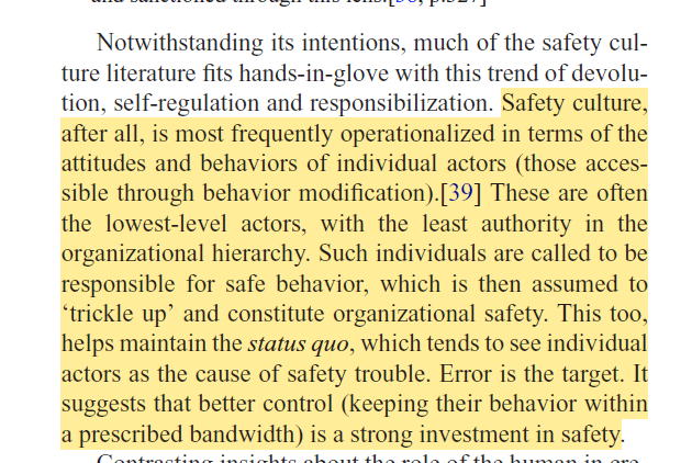 Interestingly, they argue that much of the safety culture literature “fits hands-in-glove with this trend of devolution, self-regulation and responsibilization”, which they argue is often pitched at changing the attitudes and behaviours of individuals; of whom typically have the least authority in the organisational hierarchy.