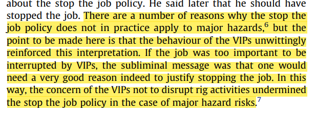 Explaining this point, Hopkins says there’s several reasons why the stop work policy doesn’t work in practice for major hazards. But relating to the rig that day, the “behaviour of the VIPs unwittingly reinforced this interpretation”. This is argued to be because, since the VIPs believed that stopping the work for them to inquire about safety and work practices was too important, the “subliminal message was that one would need a very good reason indeed to justify stopping the job”.