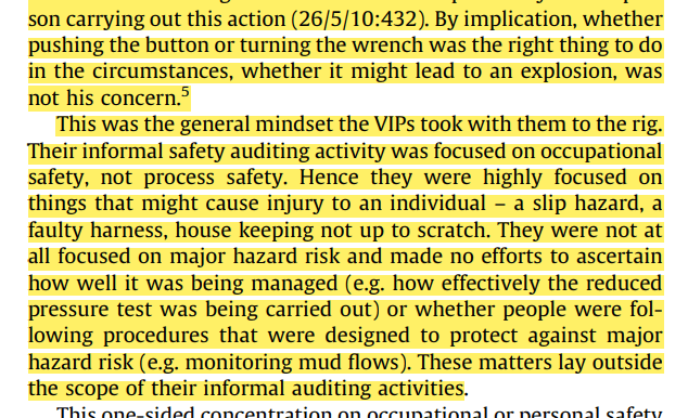 One of the VIPs in the resulting inquiries said that his focus was on occupational safety, not process safety; “for him was about whether the job of pushing the button or turning the wrench had risks specifically for the person carrying out this action …. By implication, whether pushing the button or turning the wrench was the right thing to do in the circumstances, whether it might lead to an explosion, was not his concern”.