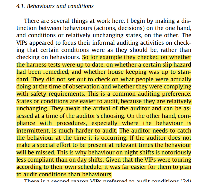 1) “The VIPs appeared to focus their informal auditing activities on checking that certain conditions were as they should be, rather than checking on behaviours”. That is, they checked whether harnesses were inspected instead of observing and inquiring into the actions and decisions of staff in the critical well processes. This is explained via the ease of inspecting states or conditions—completed inspection records—compared to actions and decisions