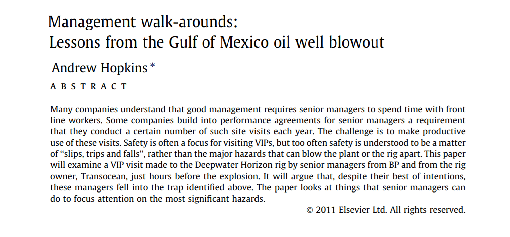Author: Hopkins, A. (2011). Management walk-arounds: Lessons from the Gulf of Mexico oil well blowout. Safety Science, 49(10), 1421-1425.