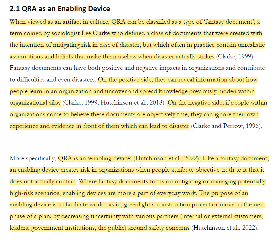 - “When viewed as an artifact in culture, QRA can be classified as a type of ‘fantasy document’, a term coined by sociologist Lee Clarke who defined a class of documents that were created with the intention of mitigating risk in case of disaster, but which often in practice contain unrealistic assumptions and beliefs that make them useless when disaster actually strikes”