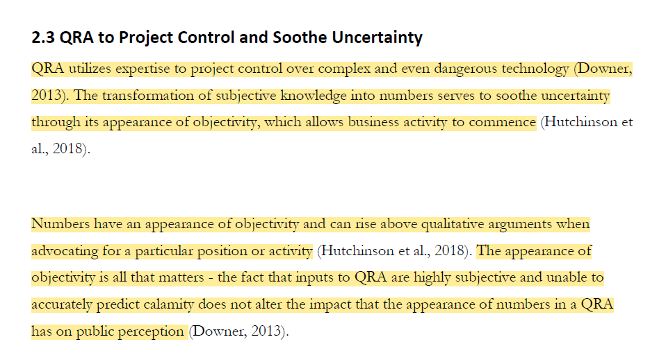 - “QRA utilizes expertise to project control over complex and even dangerous technology (Downer, 2013). The transformation of subjective knowledge into numbers serves to soothe uncertainty through its appearance of objectivity, which allows business activity to commence