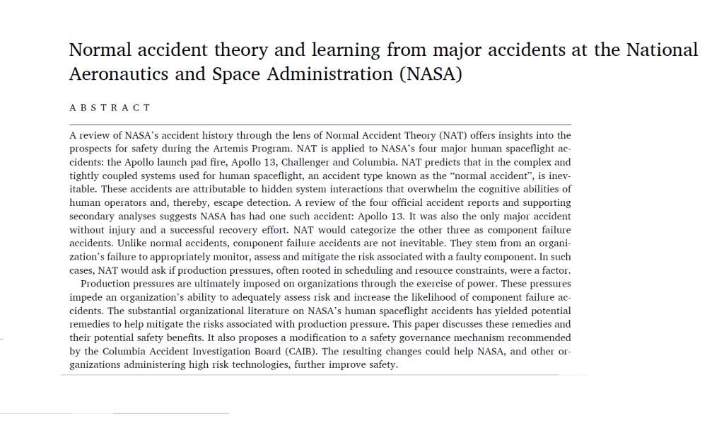 Ref: Tasca, L. (2024). Normal accident theory and learning from major accidents at the National Aeronautics and Space Administration (NASA). Space Policy, 101653.
