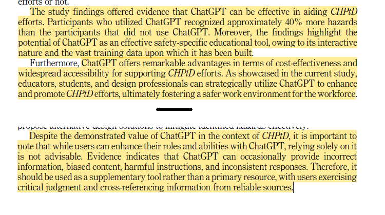 - “The results highlight the practical utility of harnessing ChatGPT in CHPtD sessions to enhance hazard recognition and ultimately promote workplace safety”