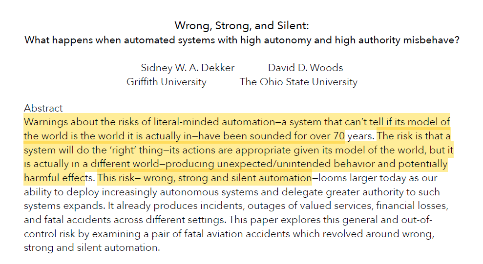 Ref: Dekker, S. W., & Woods, D. D. (2024). Wrong, Strong, and Silent: What Happens when Automated Systems With High Autonomy and High Authority Misbehave?. Journal of Cognitive Engineering and Decision Making, 15553434241240849.