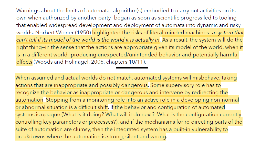 First they highlight that “Norbert Wiener (1950) highlighted the risks of literal-minded machines—a system that can’t tell if its model of the world is the world it is actually in.”