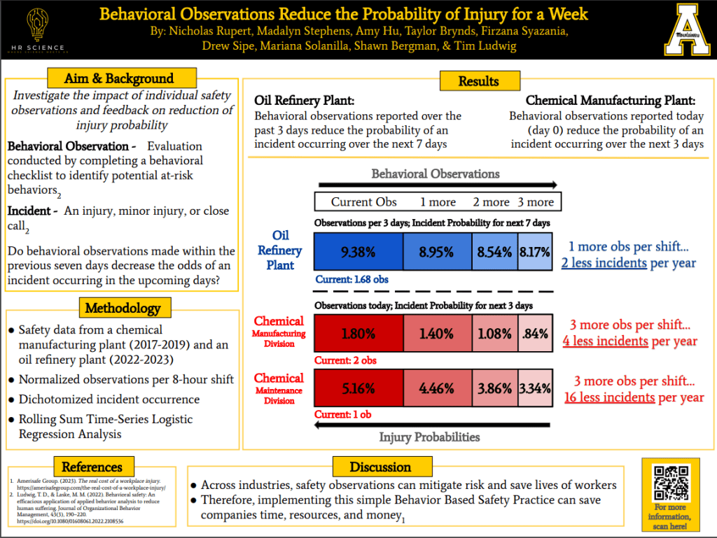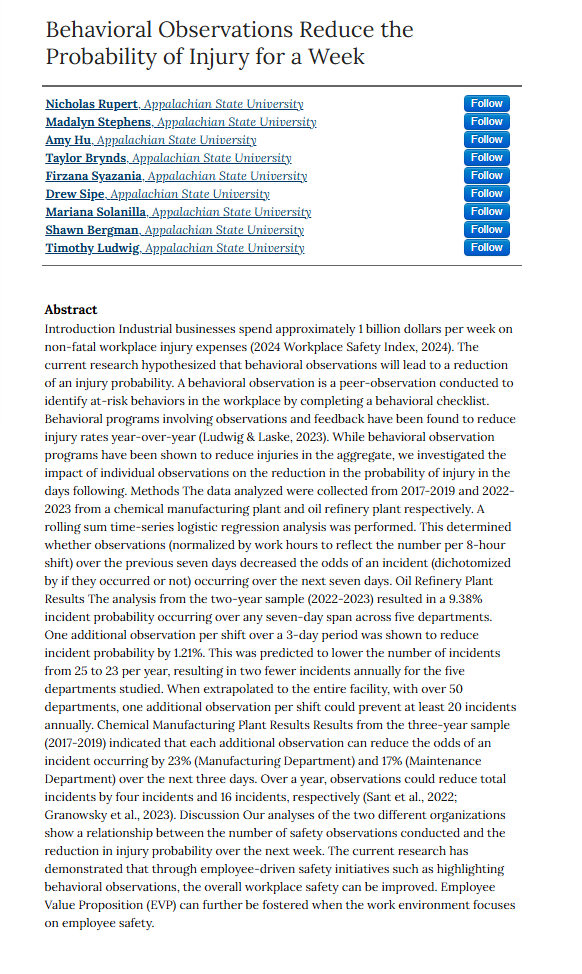 · “While behavioral observation programs have been shown to reduce injuries in the aggregate, we investigated the impact of individual observations on the reduction in the probability of injury in the days following”