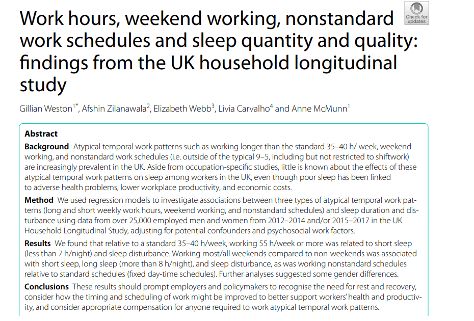 This explored the links between work hours, weekend working and atypical work schedules on sleep quantity and quality in a UK longitudinal sample.