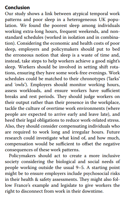 · “long and irregular schedules were associated with sleep reductions, and every hour increase in working time was associated with up to 14-min less sleep”