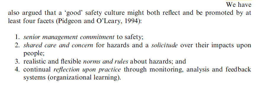 “A safety culture is in turn the set of assumptions, and their associated practices, which permit beliefs about danger and safety to be constructed”