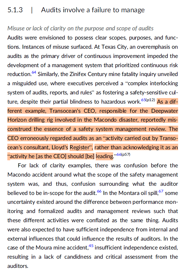 As a different example, Transocean’s CEO, responsible for the Deepwater Horizon drilling rig involved in the Macondo disaster, reportedly misconstrued the essence of a safety system management review.