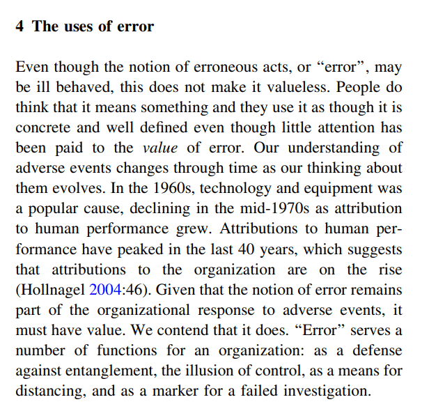 Providing background, they argue that while some see “error” as a dead-end, others like organisations use error “as if it were a stable category of human performance [and they] apply the term to performances associated with undesired outcomes, tabulate occurrences of ‘‘error’’, and justify control and sanctions through ‘‘error’’ (p87).