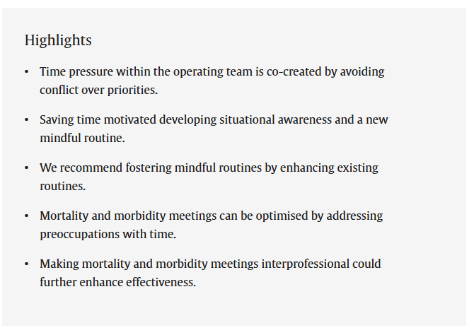 • “The observation that the established routine of morbidity and mortality meetings was not highly valued aligns with findings from other studies [40,41]. Nonetheless, this existing routine is performed automatically, even under time pressure, as it does not demand significant conscious attention (bandwidth) [20,21,42]. This presents an opportunity to optimise the routine”