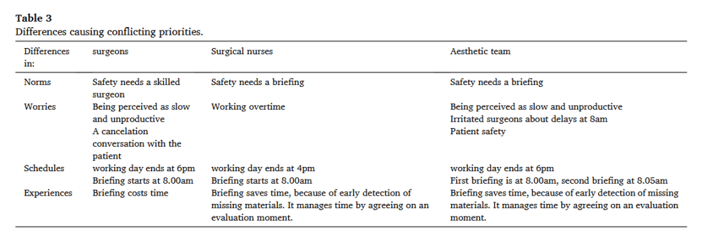 • “Conflicting priorities arose from differences in safety norms, worries about time, and beliefs about what saves time”