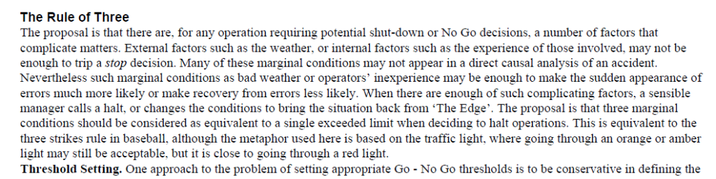 This brief conference paper from Patrick Hudson and colleague from 1998 describes a Go – No Go decision tool called the ‘Rule of Three’.