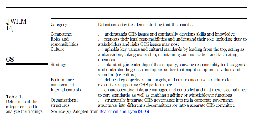 · “Empirical studies gave no insight into the scope of impact of board activities on OHS, and no studies assess the causal mechanisms by which board activities influence OHS outcomes”