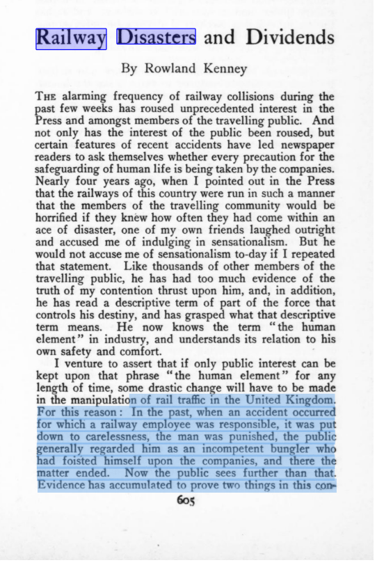 This interesting article from 1913 about rail safety comes to some interesting proposals: human fallibility is a normal and expected thing, that we should seek design and systems solutions where possible, and companies always prioritise profit over ‘safety’ trade-offs:
