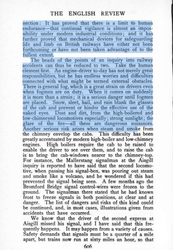 · “The heads of the points of an inquiry into railway accidents can thus be reduced to two. Take the human element first. An engine-driver to-day has not merely great responsibilities, but he has endless worries and difficulties connected with what might be termed external obstacles”