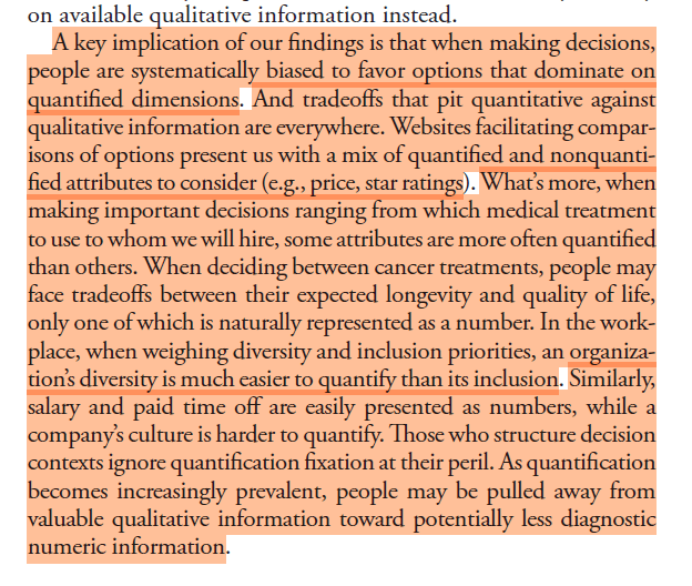 When people face decisions involving tradeoffs between qualitative and quantitative attributes, “people privilege the quantitative, favoring different job candidates, projects, and char ities based on which option is more attractive” on numerical dimensions.