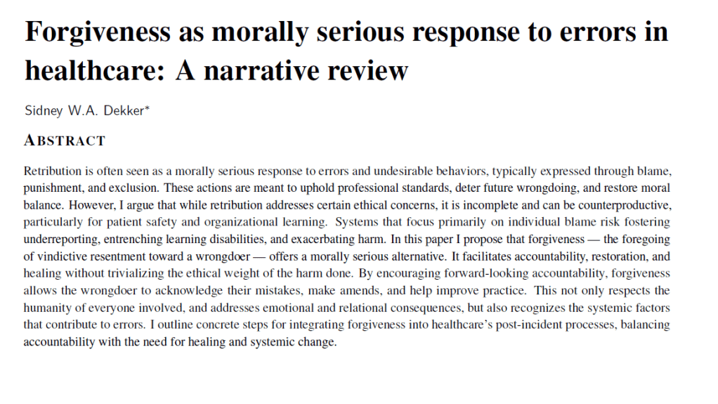 Ref: Dekker, S. W. (2024). Forgiveness as morally serious response to errors in healthcare: A narrative review. Journal of Hospital Administration, 13(2), 52-58.
