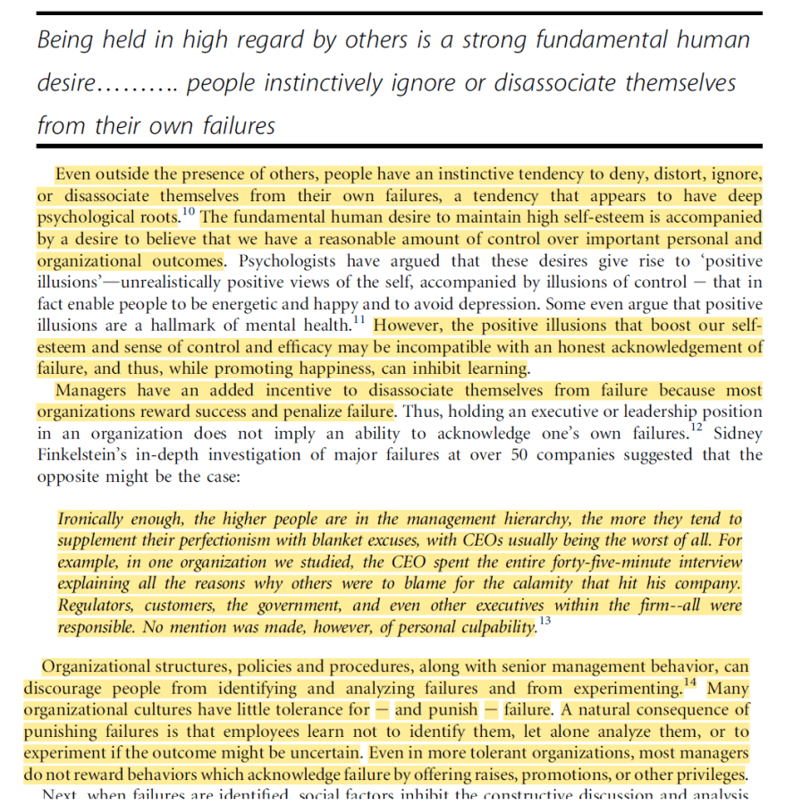 · “A natural consequence of punishing failures is that employees learn not to identify them, let alone analyze them, or to experiment if the outcome might be uncertain”