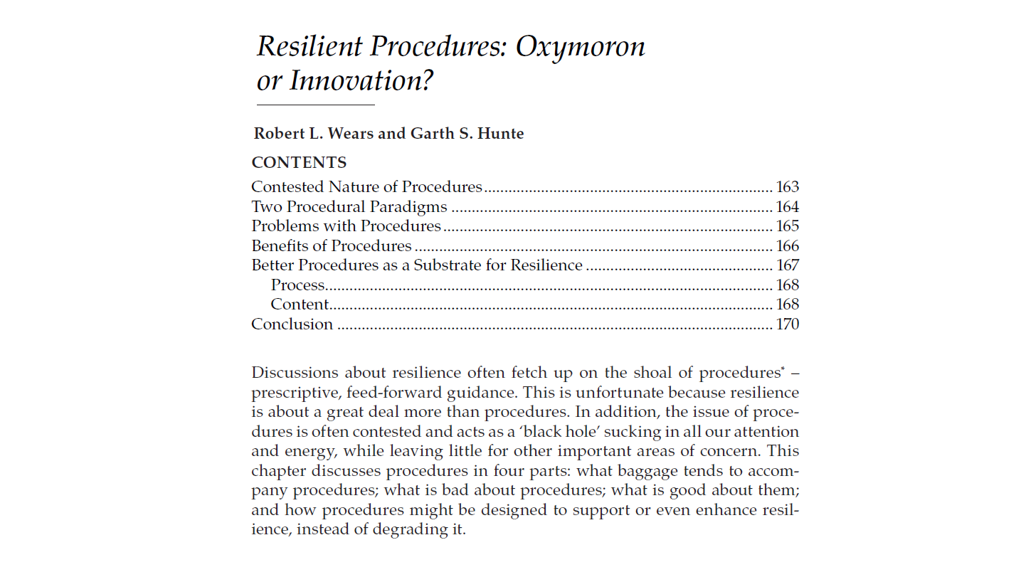 An interesting chapter from the late Bob Wears around ‘resilient procedures’. I’ve skipped heaps. They specifically explore: · what baggage tends to accompany procedures · what is bad about procedures · what is good about them · how procedures might be designed to support or even enhance resilience, instead of degrading it. Procedures are said … Continue reading Resilient Procedures: Oxymoron or Innovation?