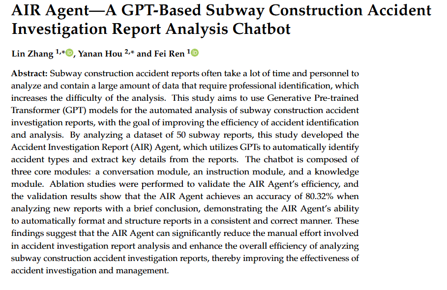 Ref: Zhang, L., Hou, Y., & Ren, F. (2025). AIR Agent—A GPT-Based Subway Construction Accident Investigation Report Analysis Chatbot. Buildings, 15(4), 527.