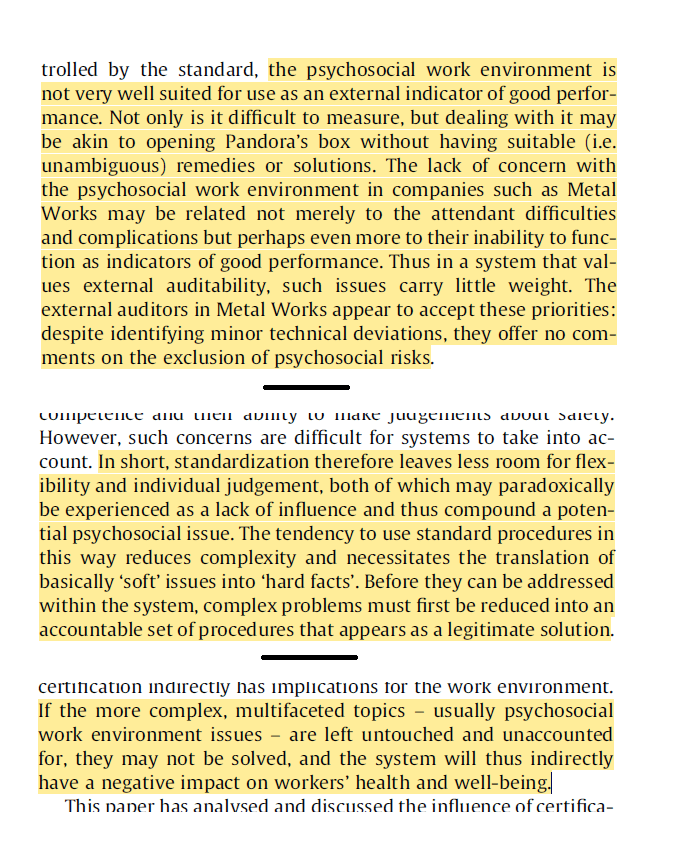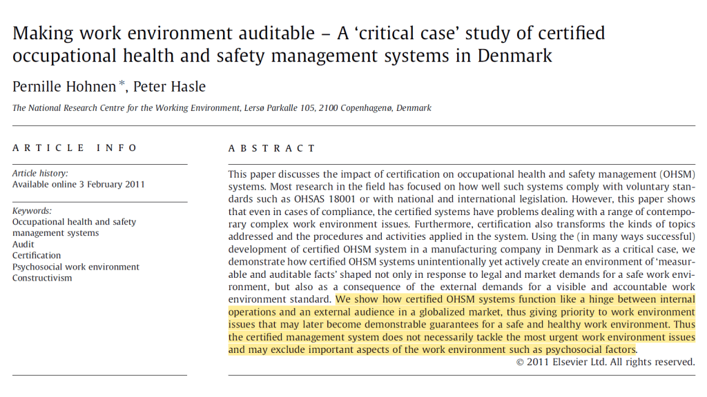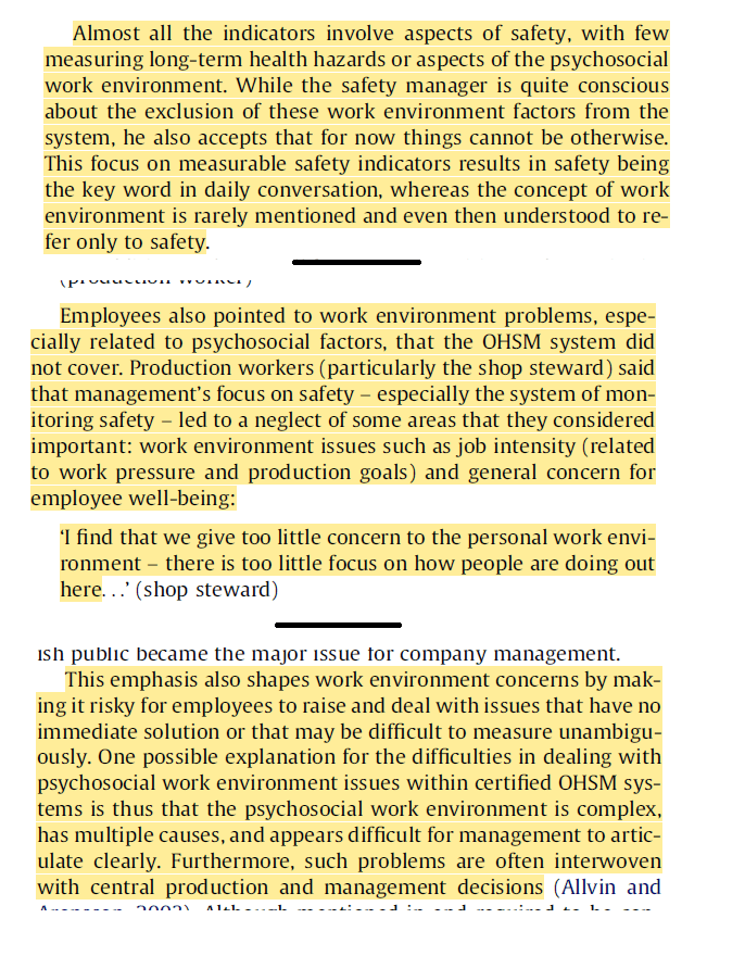 · They argue “One possible explanation for the difficulties in dealing with psychosocial work environment issues within certified OHSM systems is thus that the psychosocial work environment is complex, has multiple causes, and appears difficult for management to articulate clearly”