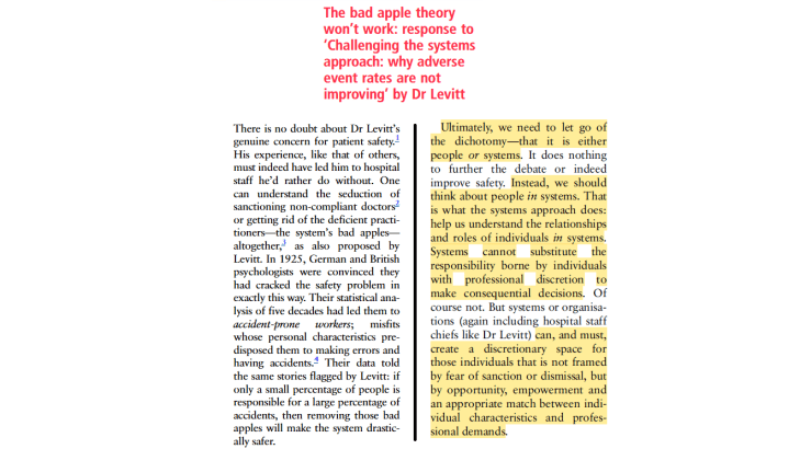 Ref: Dekker, S. W., & Leveson, N. G. (2014). The bad apple theory won’t work: response to ‘Challenging the systems approach: why adverse event rates are not improving’by Dr Levitt. BMJ quality & safety, 23(12), 1050-1051.