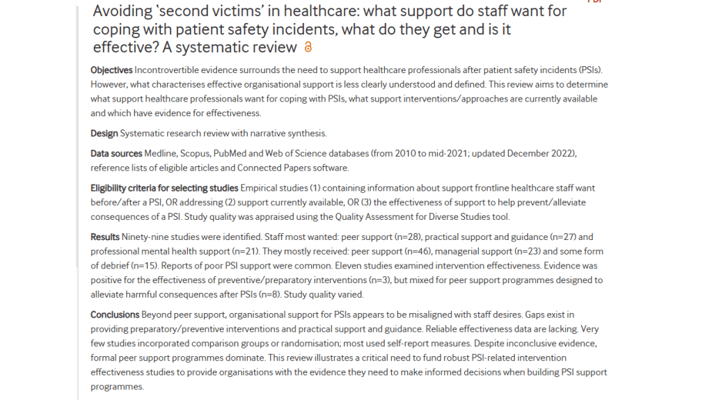 Ref: Simms-Ellis et al. (2025). Avoiding ‘second victims’ in healthcare: what support do staff want for coping with patient safety incidents, what do they get and is it effective? A systematic review. BMJ open, 15(2), e087512.