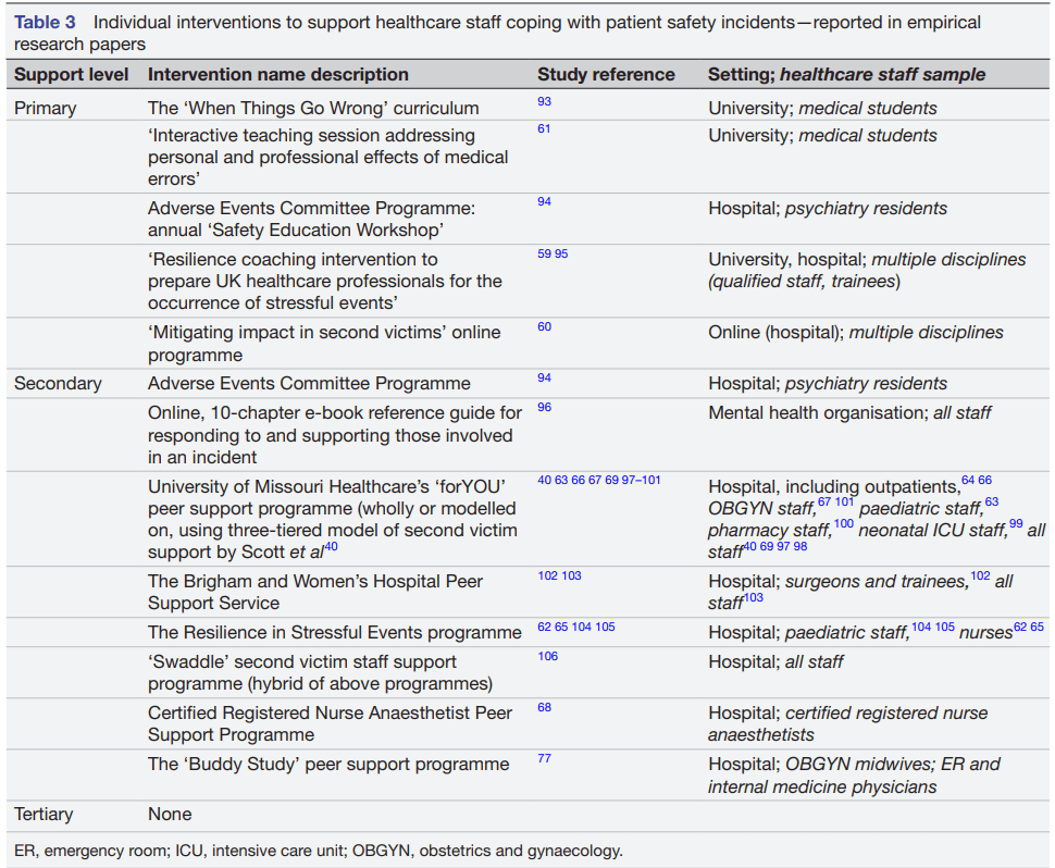 ·        Better evidence is behind primary interventions designed to “equip and prepare staff for involvement in PSIs, than for secondary interventions, which aim to mobilise support and promote staff coping after involvement in a PSI”