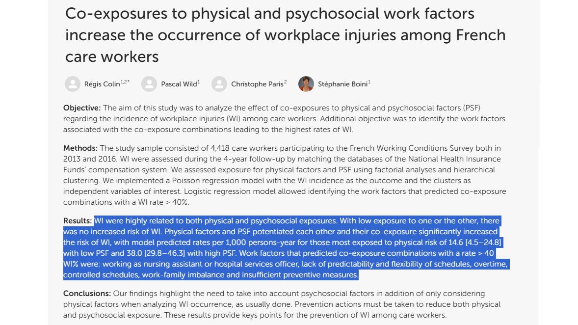 Psychosocial and physical workplace exposures found to be co-related in workplace injury (WI), according to this study. It’s one of heaps of studies highlighting the interactions between psychosocial factors and physical and psychological injury. E.g. Physical exposures were on their own were not great predictors of self-declared injury, and it was the interactions that best … Continue reading Co-exposures to physical and psychosocial work factors increase the occurrence of workplace injuries among French care workers