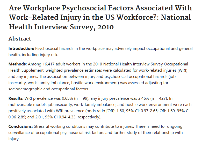 Ref: Farnacio, Y., Pratt, M. E., Marshall, E. G., & Graber, J. M. (2017). Are workplace psychosocial factors associated with work-related injury in the US workforce?: National Health Interview Survey, 2010. Journal of occupational and environmental medicine, 59(10), e164-e171.