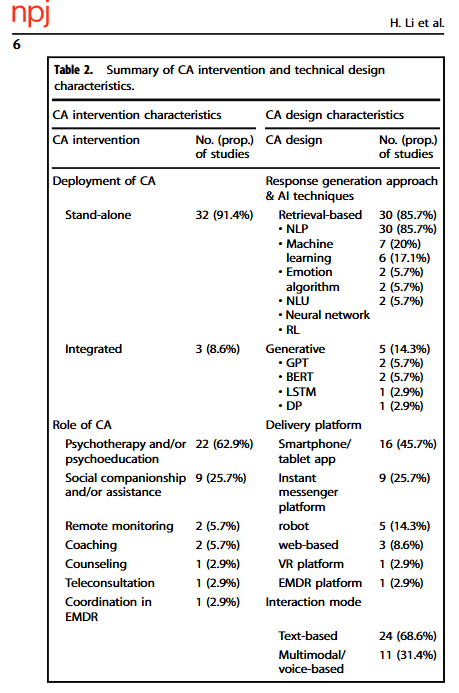 Ref: Li, H., Zhang, R., Lee, Y. C., Kraut, R. E., & Mohr, D. C. (2023). Systematic review and meta-analysis of AI-based conversational agents for promoting mental health and well-being. NPJ Digital Medicine, 6(1), 236.