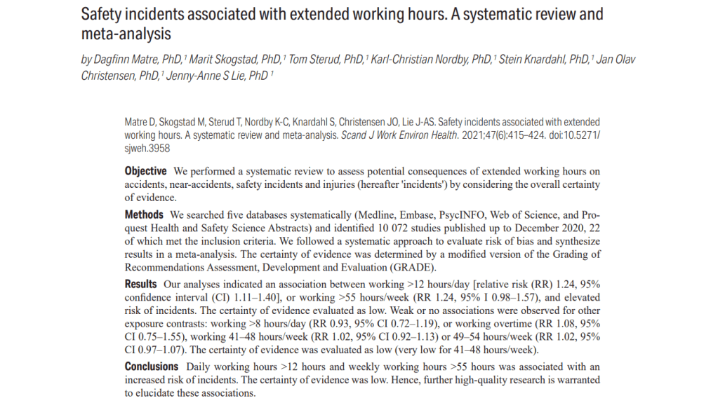22 studies were included. This study didn’t find significant evidence for all of the expected links found in other studies (e.g. weak or no association between working overtime on incidents), and this is likely a result of their assessment of the methodological weaknesses and bias of the studies.